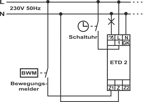 Ein anstehendes Schaltsignal an Z1 bewirkt ein Einschaltsignal, ein abfallendes Schaltsignal bewirkt ein Ausschaltsignal für den ETD 2