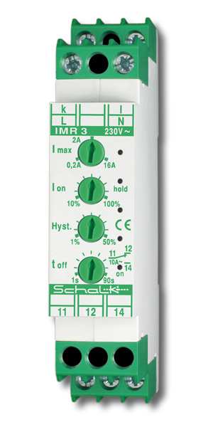 The IMR 3 is used when loads are to be switched on or off depending on a defined alternating current, e.g. automatic switching on of an extraction system in wood processing plants. The potential-free monitoring of a given power consumption for signalling and monitoring systems is also possible.