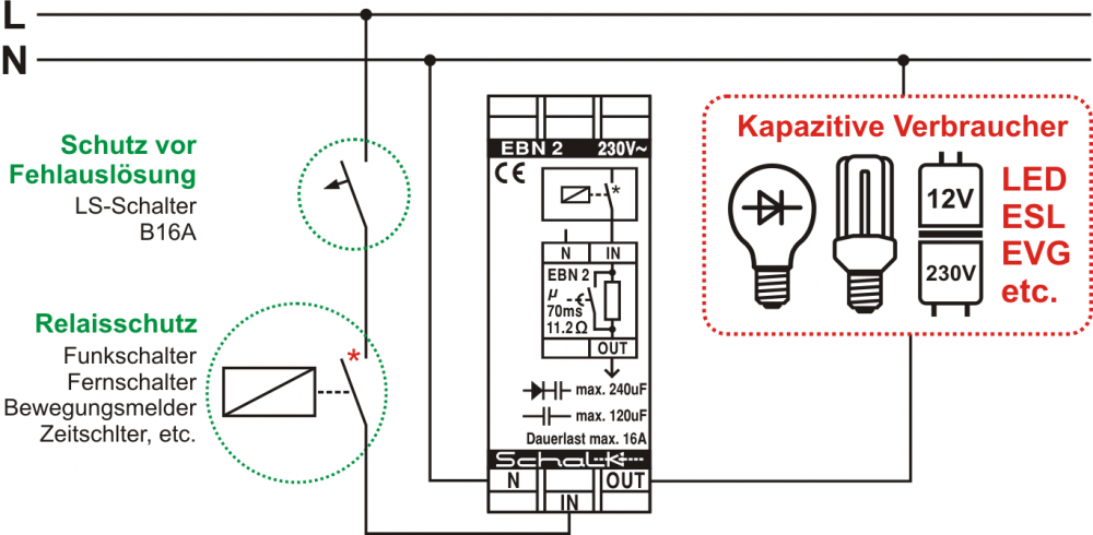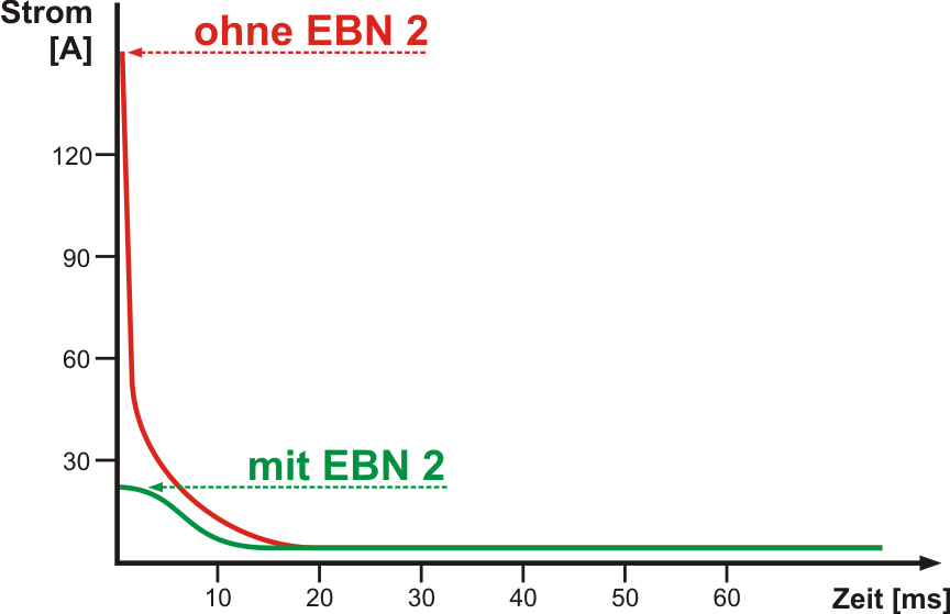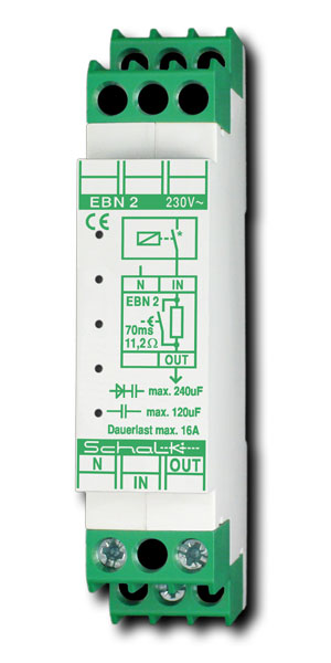 Moderne, energiesparende Leuchtmittel wie z.B. LED Lampen oder Energiesparlampen (und auch nahezu alle elektronischen Netzteile oder Vorschaltgeräte) verursachen aufgrund ihres kapazitiven Verhaltens extrem hohe Einschaltstromspitzen. Diese Stromspitzen bedeuten in der Regel eine unzulässig hohe Kontaktbelastung bei relais-geschalteter Beleuchtungstechnik. Defekte (verklebte oder verschweißte) Relaiskontakte führen daher immer häufiger zu kostspieligen Ausfällen in modernen Beleuchtungsanlagen. In größeren Anlagen können diese Einschaltströme auch das unerwünschte Auslösen von Leistungsschutzschaltern zur Folge haben. Der Einschaltimpulsstrom-Begrenzer EBN 2 unterdrücket absolut zuverlässig diese kapazitiven Einschaltströme und ermöglicht somit langfristig einen störungsfreien Anlagenbetrieb.