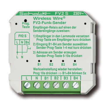 The radio connection transmitter FV2 S has 4 inputs for connecting external contacts/sensors. Any changes in the signals at the inputs of the transmitter FV2 S are transmitted directly by wireless transmission to the relay contacts of one or more radio-controlled switches of the FV2 system. The radio messages are transmitted only when the state of an input changes or at defined time intervals.